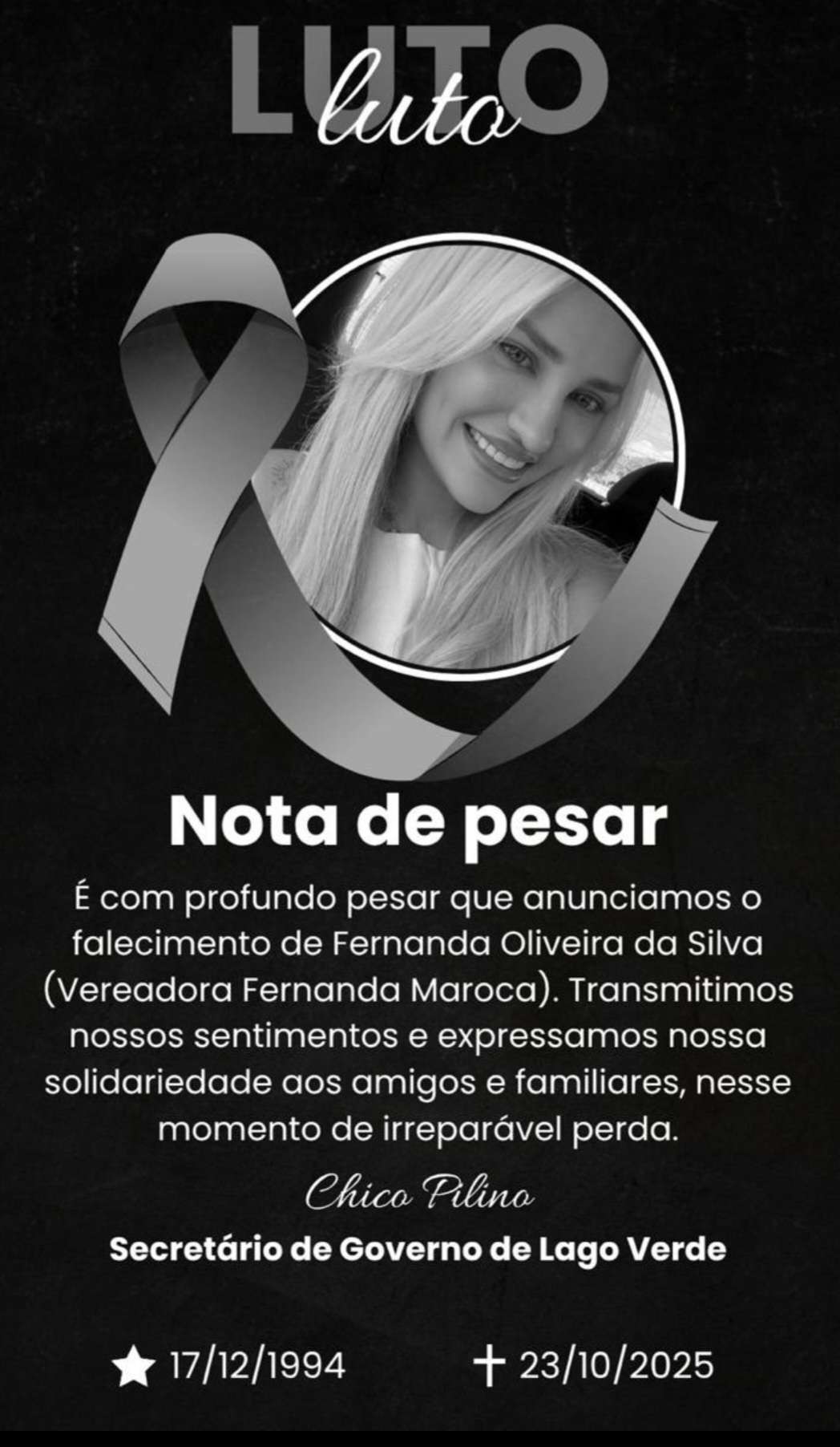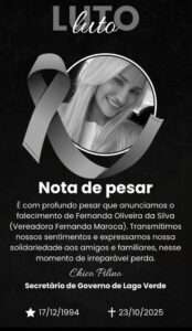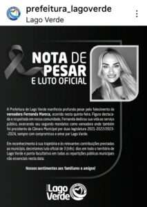 É com profundo pesar que anunciamos o falecimento de Fernanda Oliveira da Silva (Vereadora Fernanda Maroca). Transmitimos nossos sentimentos e expressamos nossa solidariedade aos amigos e familiares, nesse momento de irreparável perda.
